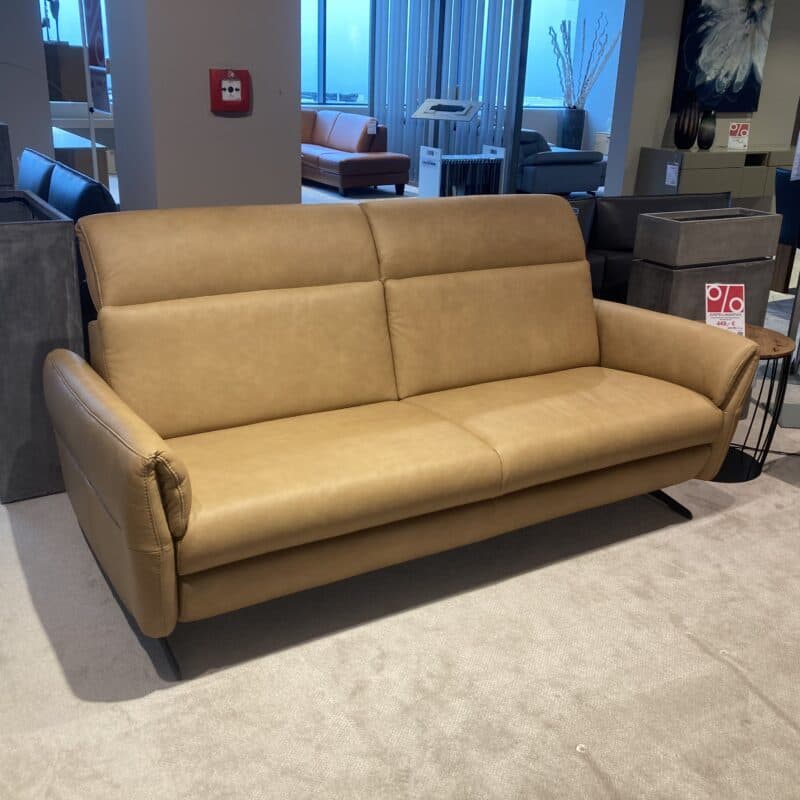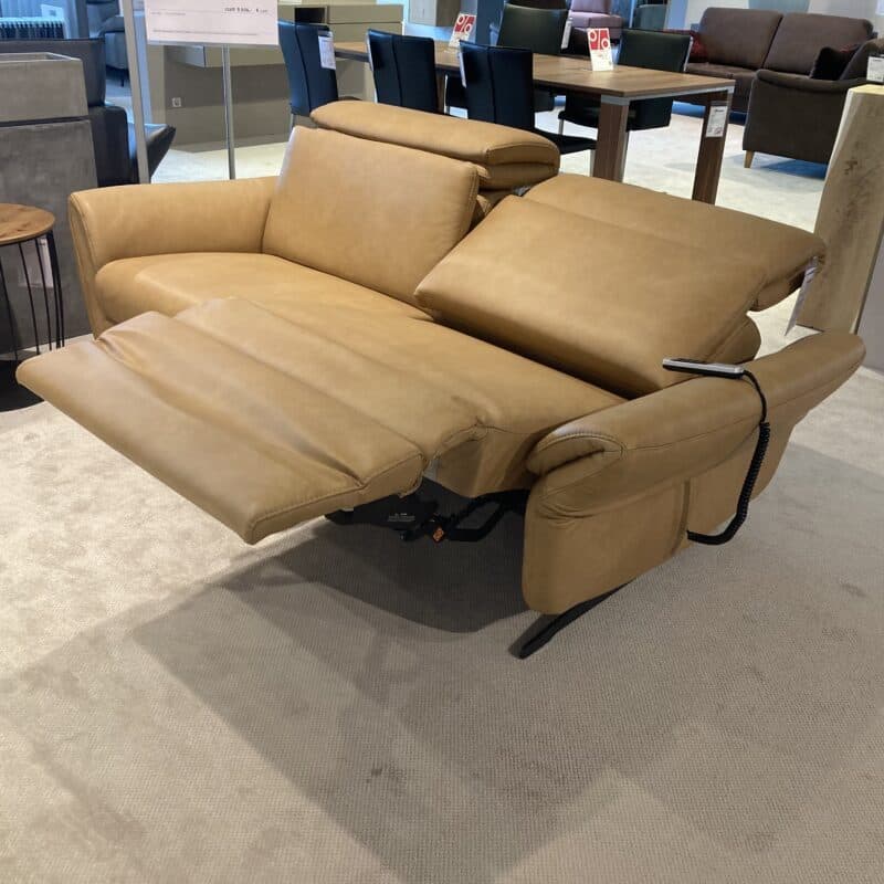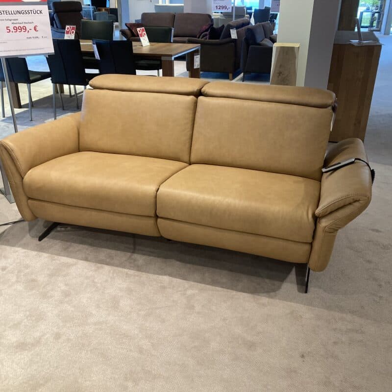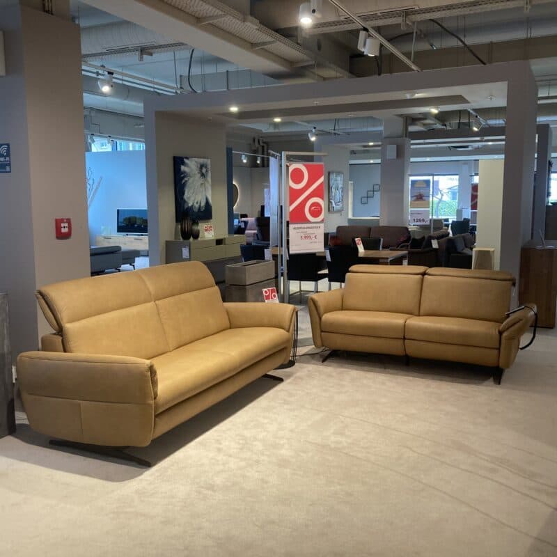 Die elegante Sofagruppe Penzin von Steinpol Polsteria vereint Technik und Design. Bezogen mit Leder LL Evita in Honey, beide 2-Sitzer bieten motorische Funktionen: Vorziehsitz, Kopfteil- und TV-Verstellung. Mit klappbaren Armlehnen, echtem Rücken und mattschwarzen Metallkufen Komfort trifft Stil. Die Sofagruppe kann gerne vor Ort in unserer Ausstellung in Stockach besichtigt werden.