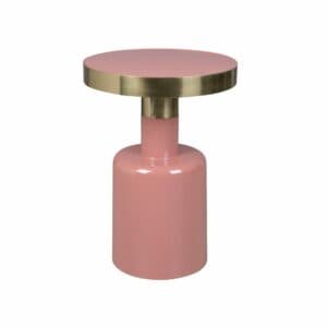 Die Tischplatte und der Sockel bestehen aus emailliertem Metall. Hier haben Sie die Wahl zwischen den ansprechenden Farben Weiß, Rosa, Blau, Schwarz und Grün. Das Highlight bildet die glänzende, messingfarbene Umrandung der Platte und des oberen Teils des Sockels. Somit entsteht ein schöner Kontrast, der Glam zum Hingucker in jedem Raum macht.