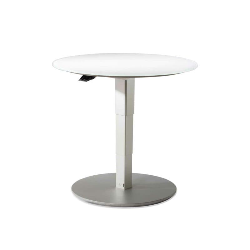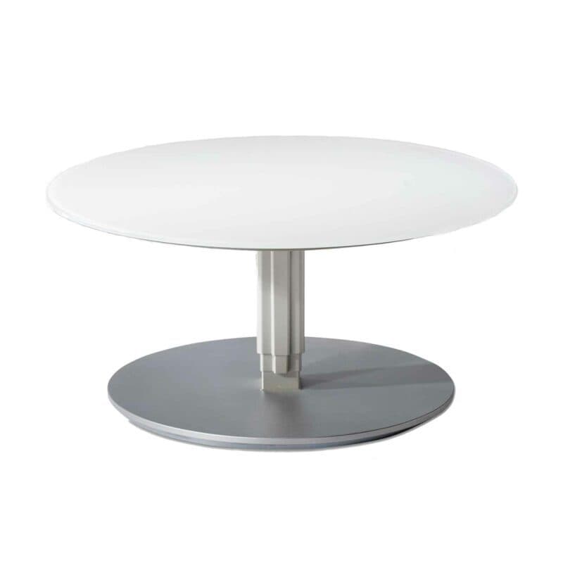 Die runde Glasplatte hat ein Durchmesser von 80 cm und wird getragen von einem perlsilbernen Liftsäulen-Gestell. Dazu harmoniert die passende Bodenplatte in Schliffoptik grau zum matten, weißen Glas. Der Couchtisch LS 824016 – Made in Germany – lässt sich bequem stets da einsetzen, wo und wie Sie ihn gerade brauchen.