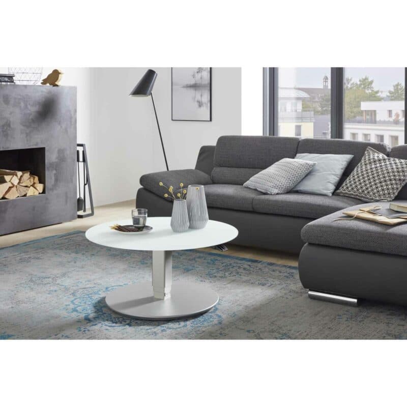 Der runde Couchtisch LS 824016 von Vierhaus eignet sich sowohl als Couchtisch sowie als Beistelltisch. Schlicht und modern kommt dieser Couchtisch mit einer praktischen Höhenverstellung und einer Tischplatte aus Glas in Weiß, welche in ein Säulengestell in Perlsilber mündet.