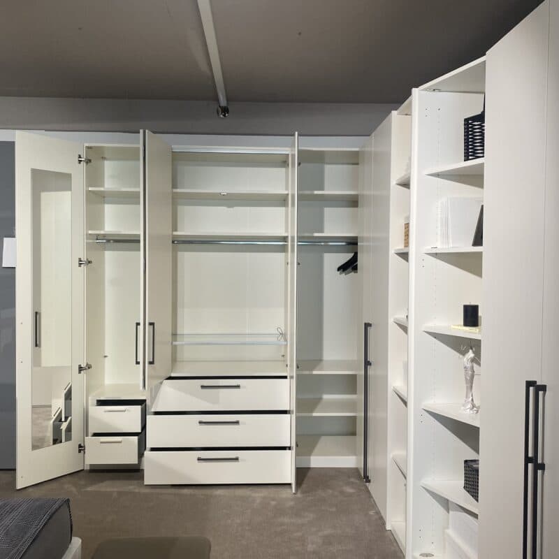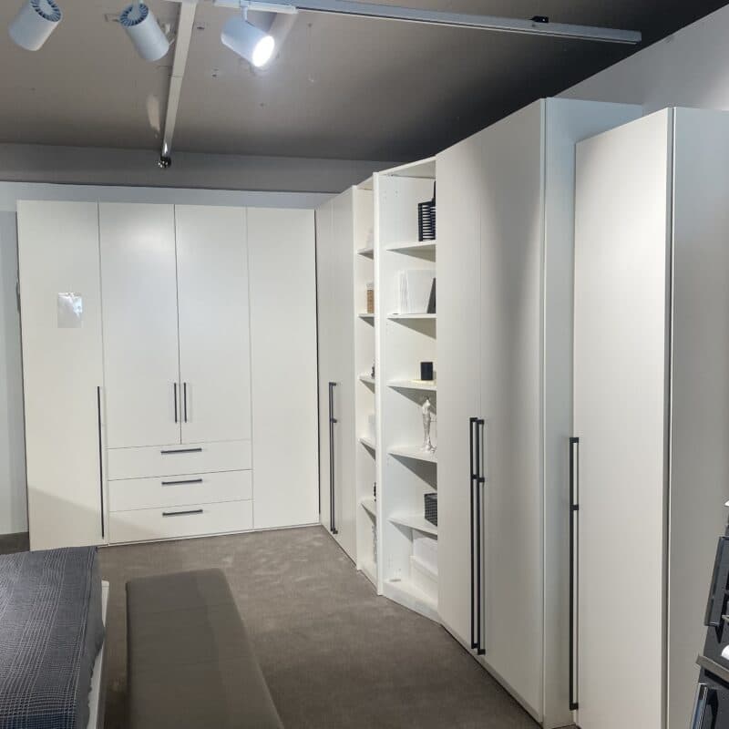 Das Schranksystem Lenjo von Loddenkemper vereint modernes Design mit Funktionalität: In Bianco Weiß matt mit Griffen in Schiefergrau bietet es vielfältige Elemente: Türen, Schubkästen, Regal, Anbauecke sowie durchdachte Zusatzausstattung wie Schubkasteneinsätze, Kleiderstangen und Einlegeboden. Perfekt für strukturierte, stilvolle Stauraumlösungen. Das Schranksystem kann gerne vor Ort in unserer Ausstellung in Lauchringen besichtigt werden.