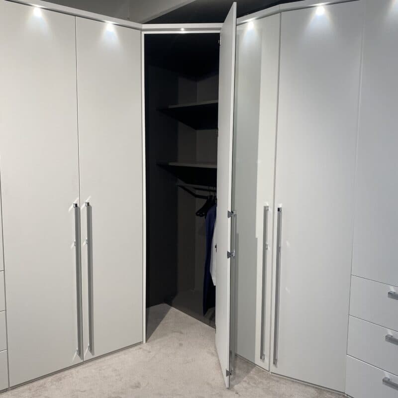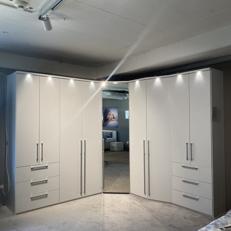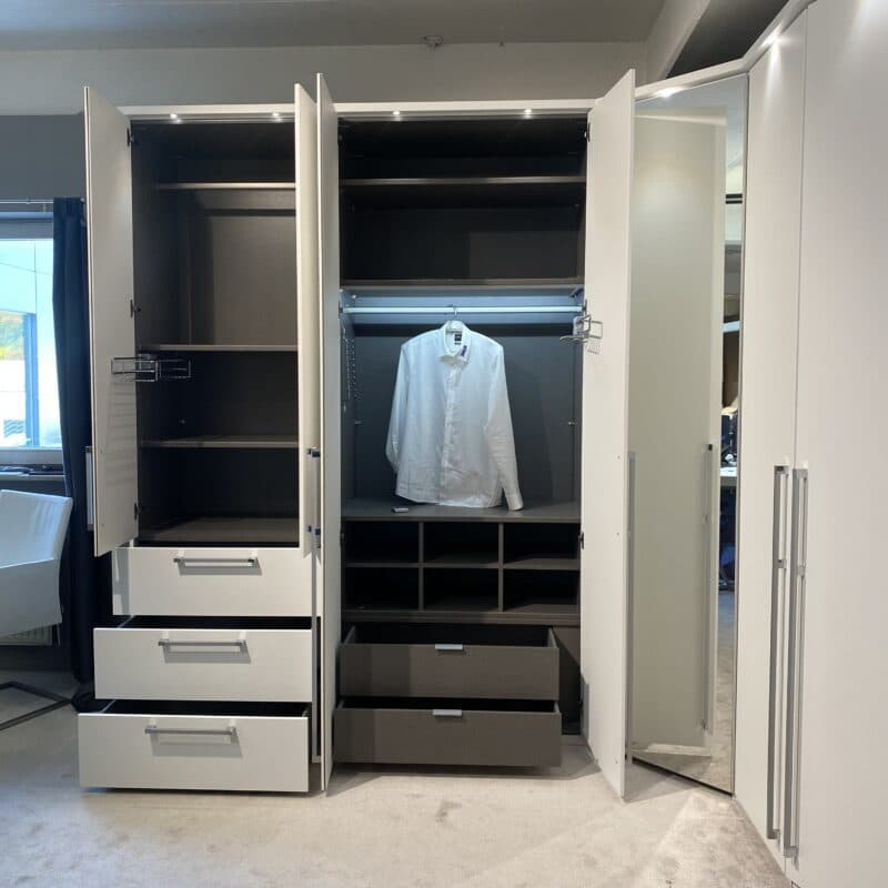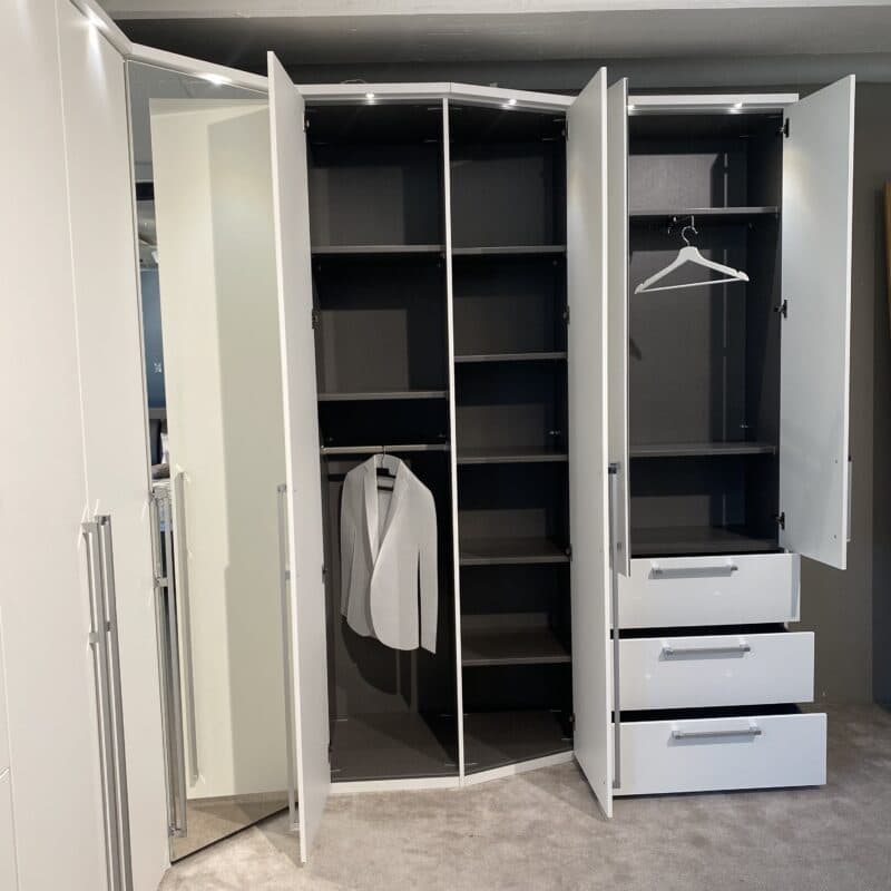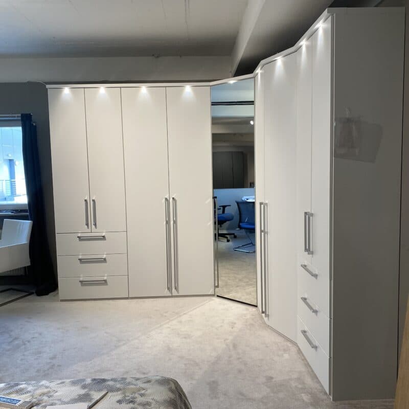 Zeitlose Schrankkombination von Nolte mit Korpus und Front in Dekor Polarweiß und eleganten Alu-Griffen in Chrom matt. Ausgestattet mit Kristallspiegel, Krawatten- und Gürtelhalter, LED-Beleuchtung mit Sensorschaltung sowie einem integrierten 9er-LED-Set mit Fernbedienung und Farbauswahl von Kalt- bis Warmweiß – funktional und stilvoll zugleich. Die Schrankkombination kann gerne vor Ort in unserer Ausstellung in Lauchringen besichtigt werden.