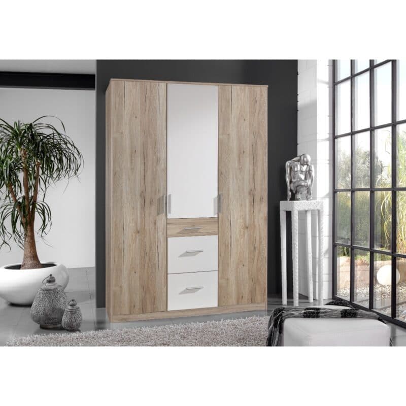 Hinter den drei Türen verbirgt sich eine durchdachte Aufteilung, die viel Stauraum bietet. Im mittleren Teil befinden sich drei geräumige Fächer, die durch zwei flexible Einlegeböden unterteilt sind. Kleinere Teile wie Socken oder Accessoires finden in den drei Schubfächern darunter ihren Platz. Die äußeren Abteile des Schranks sind mit jeweils einer praktischen Kleiderstange und einem Fachboden ausgestattet. Darin lassen sich Kleidungsstücke hängend und übersichtlich verstauen.