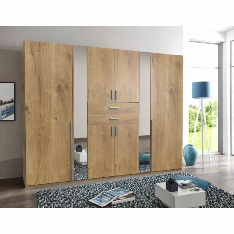 Der Kleiderschrank Vanea von Wimex punktet nicht nur mit der tollen Optik, sondern auch mit durchdachten Stauraum-Lösungen. Hinter den großen Türen verbergen sich zwei Einlegeböden und zwei Kleiderstangen, an denen Sie Kleider und Mäntel optimal aufhängen können. Für zusammengelegte Kleidung finden Sie hinter den vier kleineren Türen Platz auf drei weiteren Einlegeböden. Wäsche und Accessoires können Sie bequem in den mittig platzierten Schubladen aufbewahren, ohne sich bücken zu müssen.