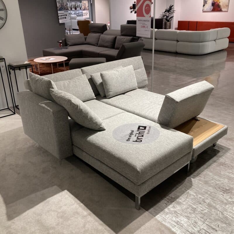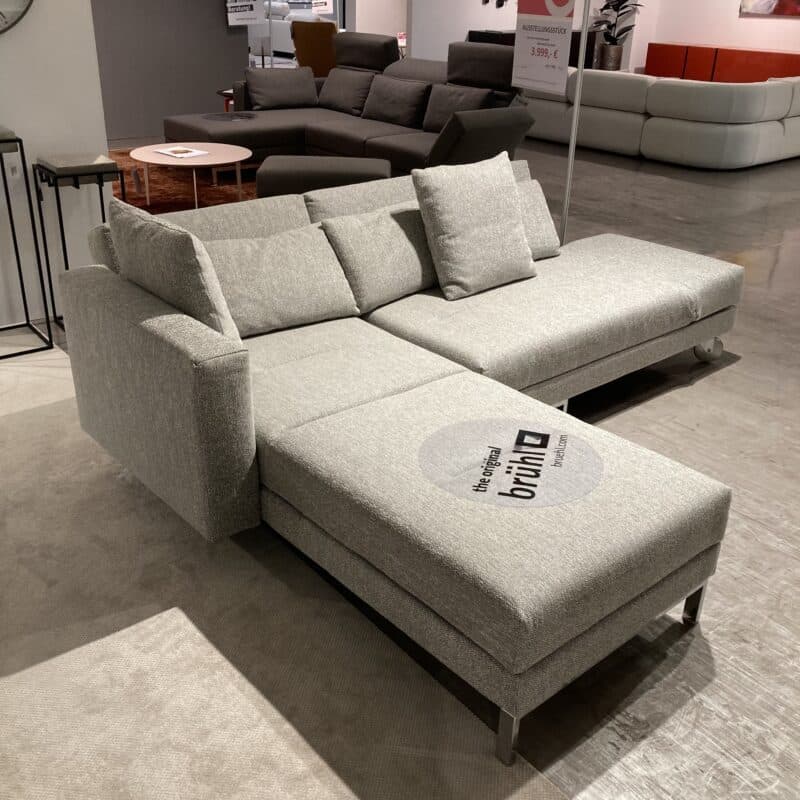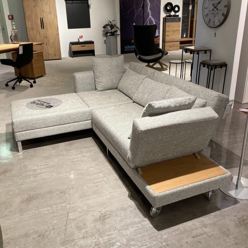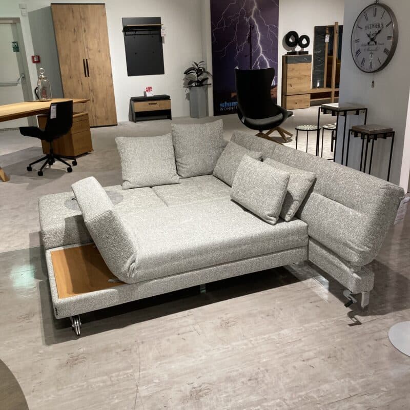 Die Brühl-Serie Four-two soft vereint elegantes Design und höchsten Komfort. Dieses Ensemble besteht aus einem Longchair links und einem Drehsofa rechts mit hell geölter Eiche-Ablage. Der graue Stoffbezug mit passendem Kissenset, das verchromte Kufengestell und Aluminiumrollen ergänzen die stilvolle Liegefläche von 150 x 210 cm perfekt. Das Sofa kann gerne vor Ort in unserer Ausstellung in Stockach besichtigt werden.