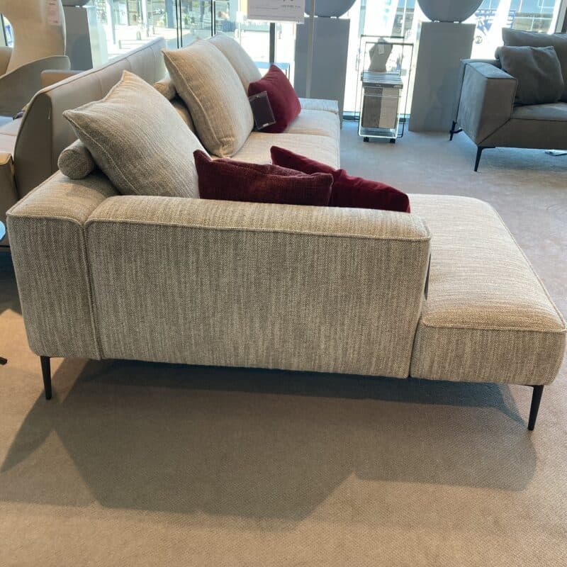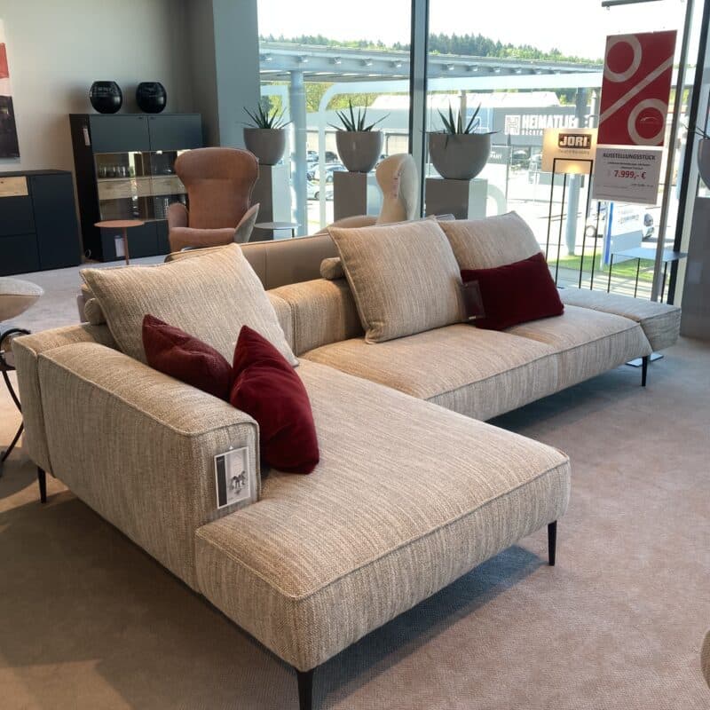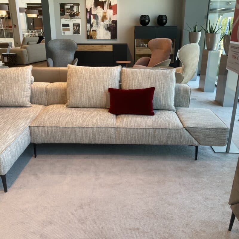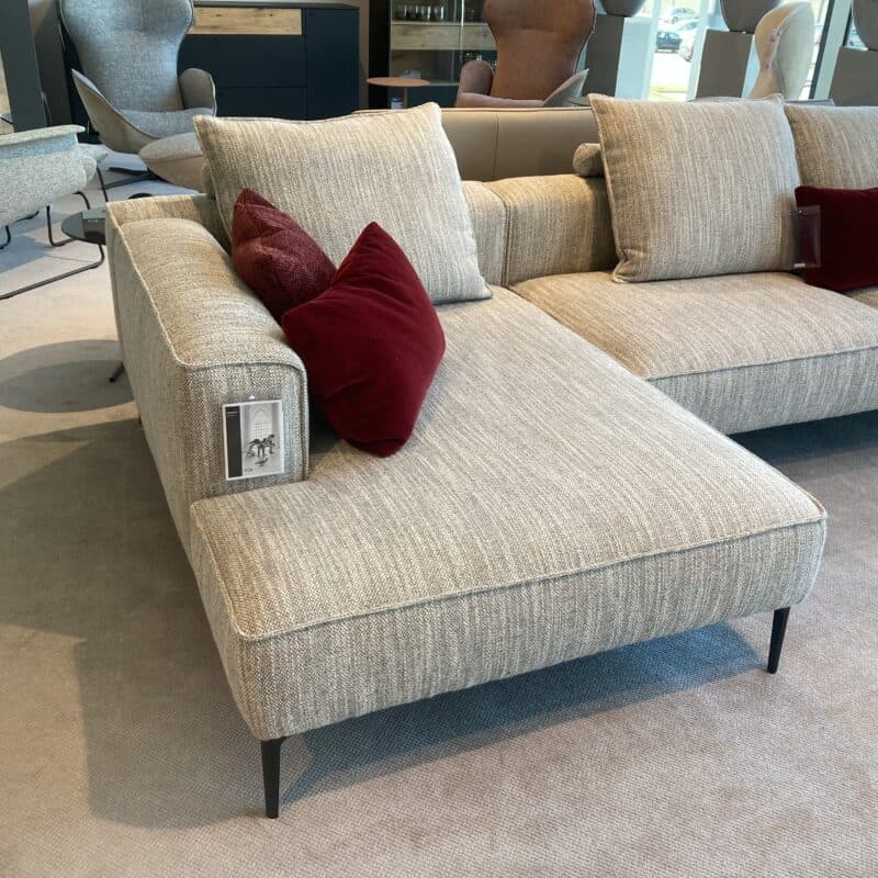 Die Elementgruppe Landscape von Jori vereint modernes Design mit höchstem Komfort. Sie besteht aus einem Chaiselongue mit fester Armlehne links und einem Anbausofa mit klappbarer Armlehne rechts. Bezogen mit einem beigem Stoff , schwarzen Metallfüßen und drei passenden Rückenkissen, stilvoll und funktional zugleich. Die Elementgruppe kann gerne vor Ort in unserer Ausstellung in Stockach besichtigt werden.