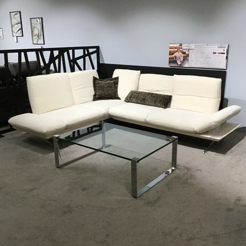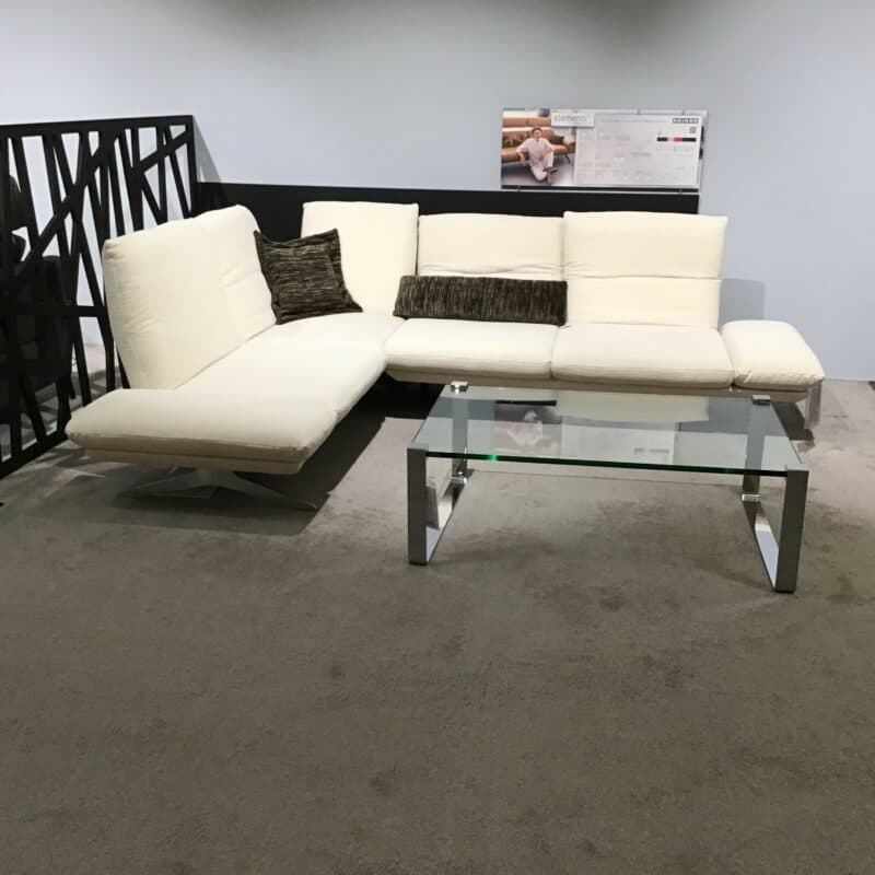 Die Polstergruppe Cono von Koinor überzeugt mit modernem Design und höchstem Komfort. Sie umfasst eine Anbauecke mit offenem Funktionsabschluss, ein mittleres Sofa mit Armlehne rechts, Nieren- und Flatterkissen. Verstellbare Rücken- und Kopfteile, Stoffbezug Empire sowie ein elegantes Nickel-satiniertes Kufengestell runden das Ensemble ab. Die Polstergruppe kann gerne vor Ort in unserer Ausstellung in Weil am Rhein besichtigt werden.