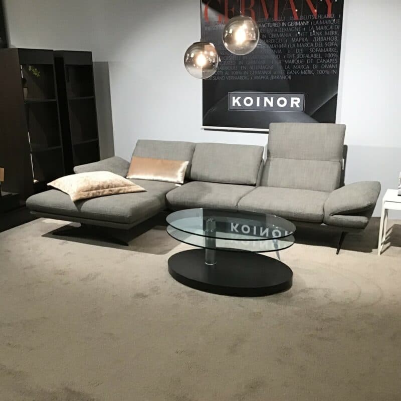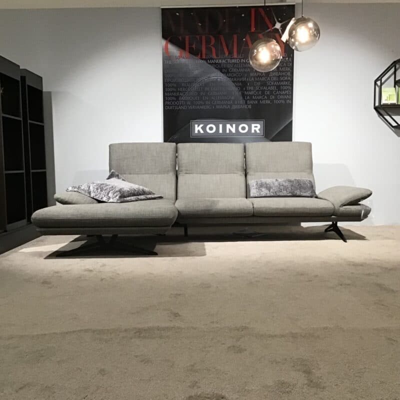 Die Koinor Polstergruppe Cono überzeugt mit modernem Design und höchstem Komfort. Ausgestattet mit Liege, Sofa, legerer Polsterung, Butterfly-Kissen und Neigungsverstellung, bietet sie flexible Entspannung. Der graue Stoffbezug Kaleido harmoniert perfekt mit dem schwarzen Metall-Kufengestell. Inklusive Nieren- und Flatterkissen für gemütliche Akzente. Die Polstergruppe kann gerne vor Ort in unserer Ausstellung in Weil am Rhein besichtigt werden.