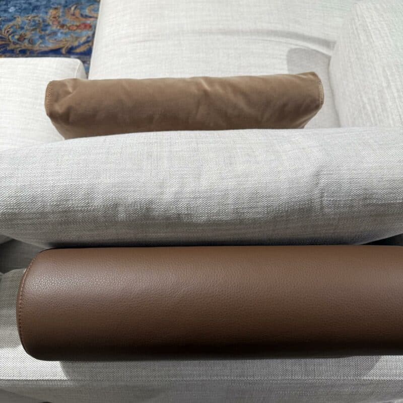 Die Polstergruppe Marlo von Weibelweibel bietet eine Kombination aus Komfort und Design. Sie besteht aus einer breiten Liege, einem drehbaren 2er-Element, zwei Rückenkissen, einem Vorstellkissen mit Bezug aus Textilgewebe Lima Tobacco, und einer Funktionsrolle in Leder Santana Tobacco. Der Hauptbezug in Textilgewebe Gioia Seidengrau harmoniert mit schwarzen Holzfüßen. Zusätzlich ist die Sitztiefe verstellbar. Die Polstergruppe kann gerne vor Ort in unserer Ausstellung in Lauchringen besichtigt werden.