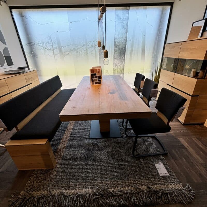 Entdecken Sie die moderne Essgruppe Willich von Wimmer. Gefertigt aus geölter Asteiche, kombiniert sie natürlichen Charme mit elegantem Design. Der ausziehbare Säulentisch, drei Freischwinger-Stühle und eine Sitzbank mit grauem/schwarzem Textilgewebe sowie schwarze, matte Metallfüße sorgen für stilvollen Komfort und Flexibilität in Ihrem Essbereich. Die Essgruppe kann gerne vor Ort in unserer Ausstellung in Lauchringen besichtigt werden.
