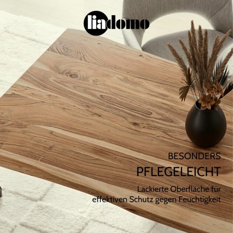 Mit dem Sammy Baumkantentisch der Marke Liadomo zieht ein Stück echte Natur in Ihr Esszimmer ein. Die Tischplatte mit Baumkante aus massivem Akazienholz macht jeden Tisch zum Unikat. Für den modernen Look sorgen drei optionale Gestell aus Metall in Schwarz. Wählen Sie außerdem aus sieben verschiedenen Größen ganz nach Ihrem Bedarf.