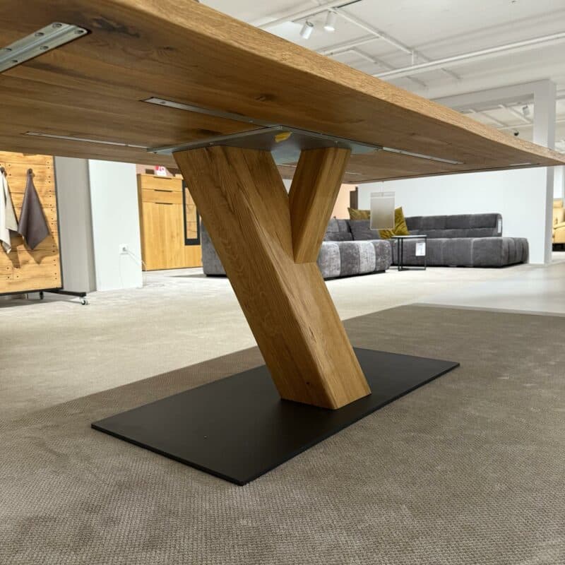 Der Säulenesstisch Wodan* Z30-220095 von Wimmer aus Asteiche mit Hartwachsöl Natur besticht, durch eine durchgehende Holzplatte mit natürlicher Baumkante und Schrägkante an den Stirnseiten. Offene, ausgeschliffene Äste und Risse unterstreichen den rustikalen Charakter. Die Metallplatte in RAL7021 verleiht dem Tisch eine moderne Note. Der Säulenesstisch kann gerne vor Ort in unserer Ausstellung in Lauchringen besichtigt werden.