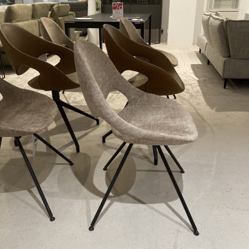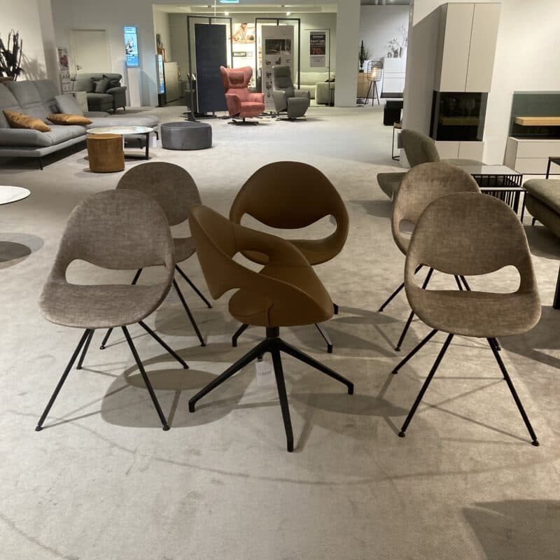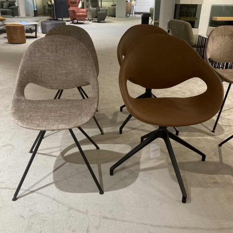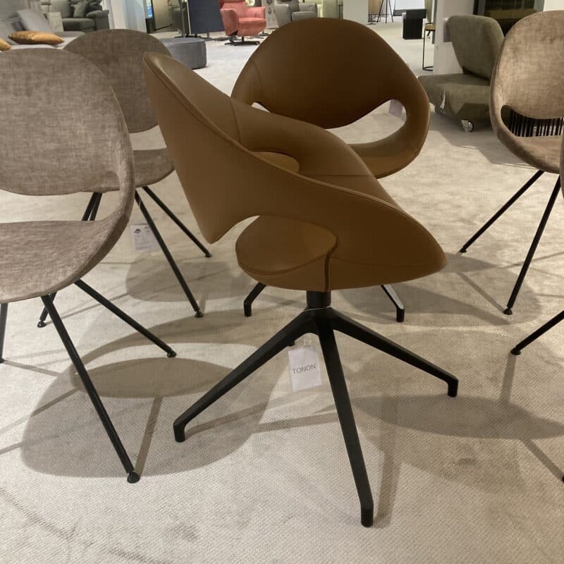 Die elegante Stuhlgruppe Moon von Tonon vereint edles Design und höchsten Komfort. Zwei Sessel Moon 908/82 mit Lederbezug Polo in Braun und Vierfußgestell aus schwarzem Aluminium ergänzen vier Stühle Moon 908/22 mit Stoffbezug Tessuto in Beige – eine harmonische Kombination aus Stil, Qualität und moderner Eleganz. Die Stuhlgruppe kann gerne vor Ort in unserer Ausstellung in Stockach besichtigt werden.