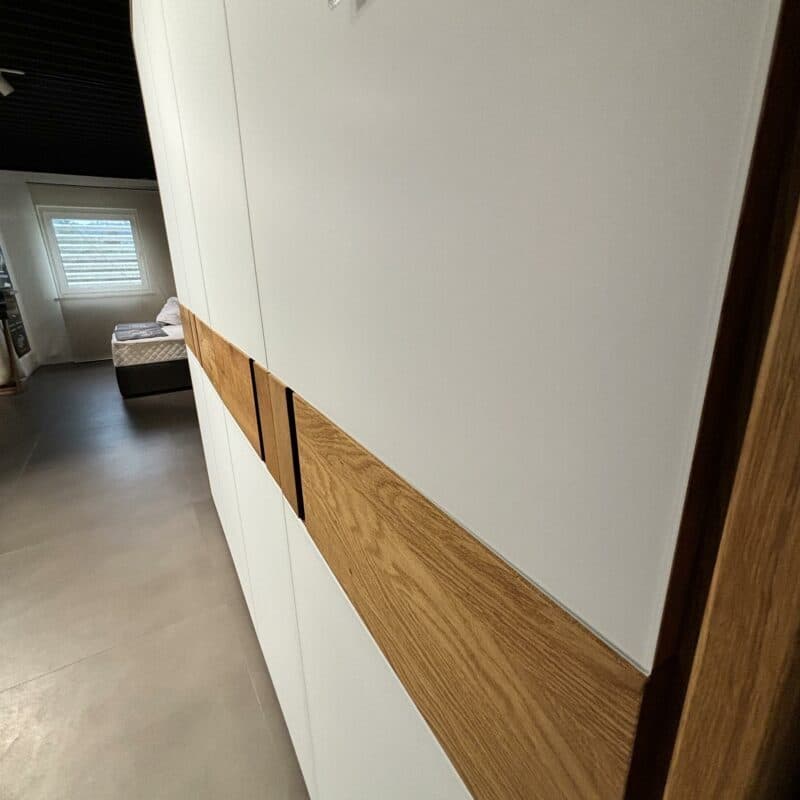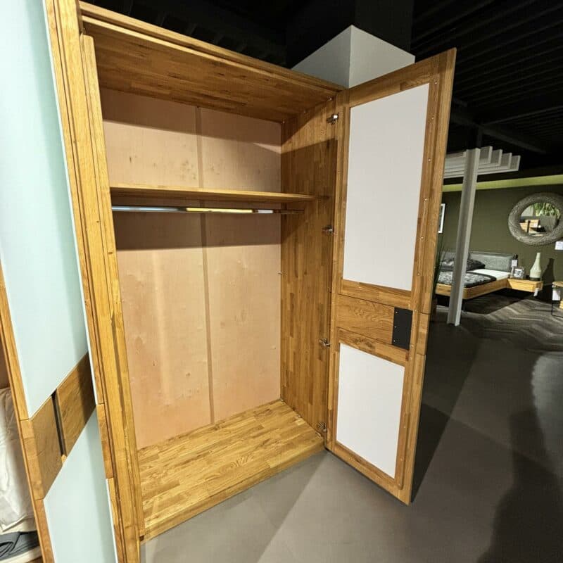 Entdecken Sie den geräumigen Kleiderschrank Nex Jersey von M&H. Die Front aus weiß mattiertem Glas und der Korpus aus geölter Wildeiche verleihen Ihrem Schlafzimmer stilvolle Eleganz. Mit vier Türen bietet er großzügigen Stauraum und passt perfekt in jedes moderne Interieur. Das Kleiderschrank kann gerne vor Ort in unserer Ausstellung in Lauchringen besichtigt werden.