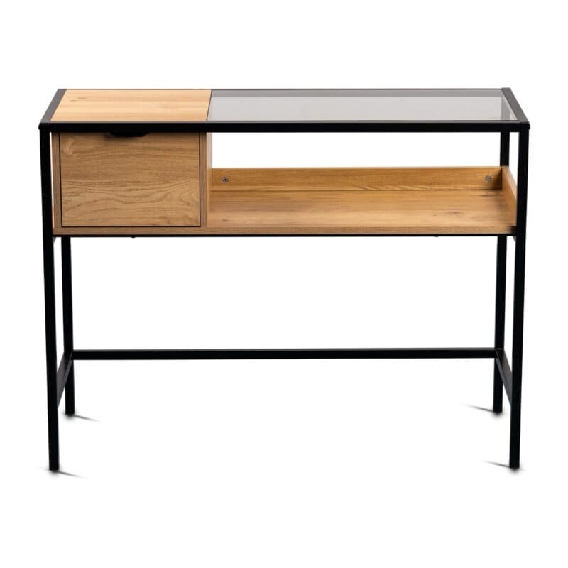 Marysia überzeugt mit einem modernen Design im Industrial Stil. Die Tischplatte aus robustem Sicherheitsglas sorgt für eine leichte Optik und wird von einem stabilen Metallgestell in Schwarz getragen. Die Ablage sowie die Schublade sind in Eiche Nachbildung gehalten und komplettieren das Design mit einem natürlichen Touch.