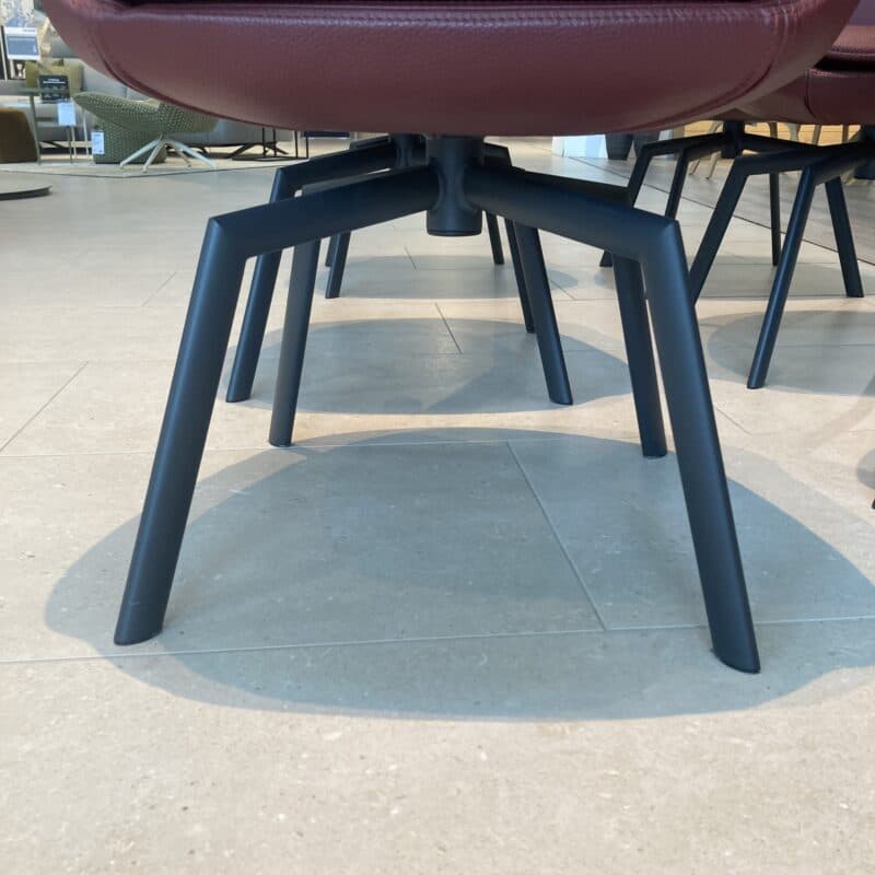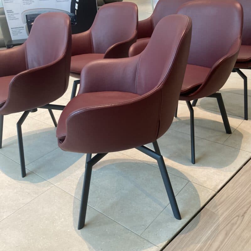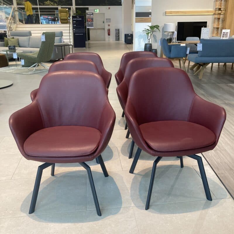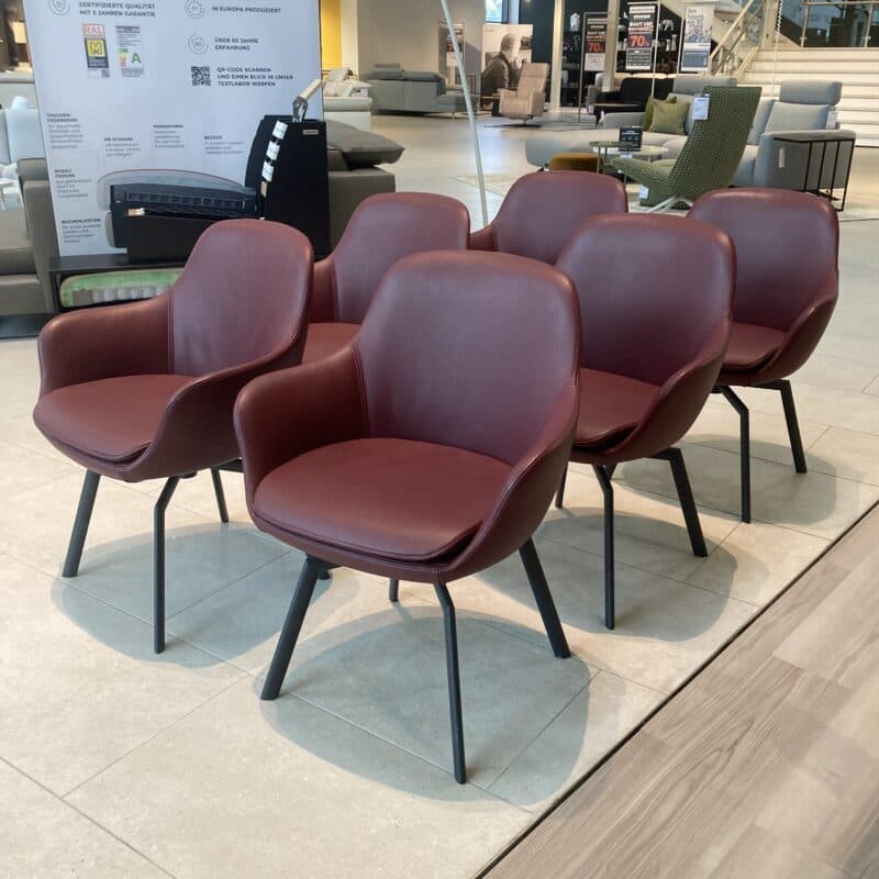 Bequemes Schalenstuhl-Set von Wimmer, bestehend aus 6 Stühlen mit edlem Lederbezug Colorado in Kaminrot und Ton-in-Ton-Naht. Die fest gepolsterten Sitze stehen auf einem schwarzgrauen Spinnenfuß-Gestell aus Metall mit Drehfunktion und integrierten Gleitern – stilvoll, komfortabel, funktional. Das Schalenstuhl-Set kann gerne vor Ort in unserer Ausstellung in Stockach besichtigt werden.