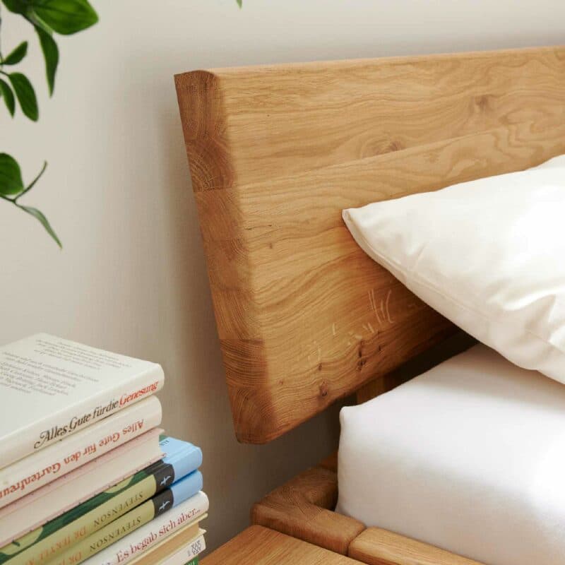 Wenn Sie Möbel aus natürlichem Massivholz lieben, ist dieses Doppelbett genau die richtige Wahl für Sie. Es besteht vollständig aus Wildeiche massiv geölt und wurde hochwertig verarbeitet. Das Öl bringt zudem die individuellen Maserungen, Astlöcher und Strukturen zum Leuchten und schützt das Holz vor Schmutz. Masssivholz ist ein lebendiges Material, es atmet, speichert Wärme und filtert schädliche Stoffe aus der Luft. Gerade in einem Schlafzimmer sind Sie mit Möbeln aus Massivholz immer richtig beraten.