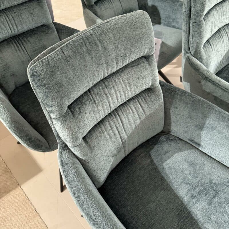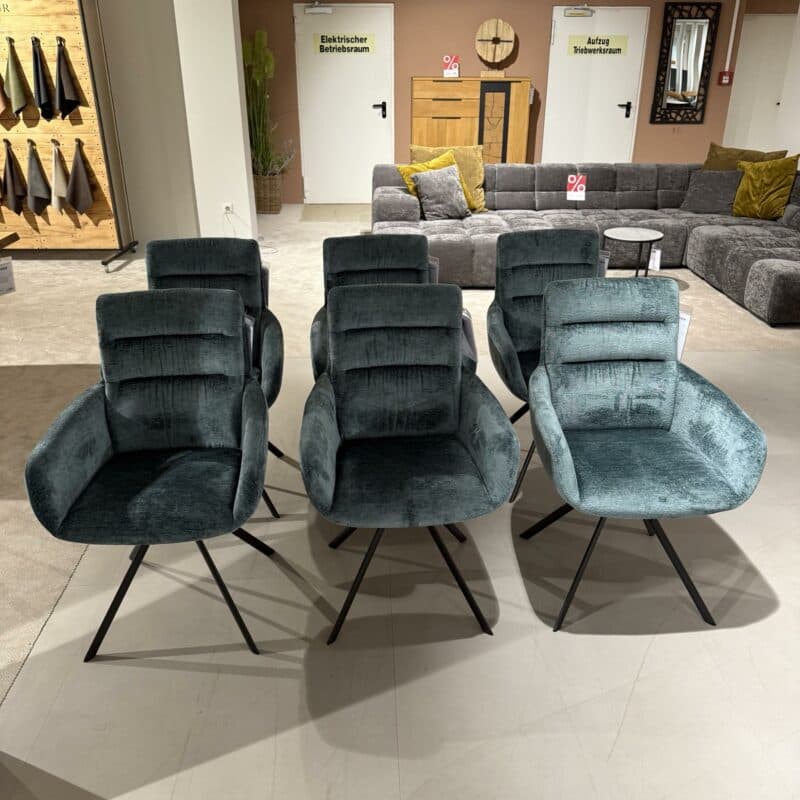 Moderne Stuhlgruppe von Venjakob bestehend aus 6 Stühlen mit hochwertigem Stoffbezug Frankfurt in Petrol (PGA) und robustem Metallgestell in Anthrazit matt. Die Stühle bieten dank integrierter Drehfunktion besonderen Komfort und Bewegungsfreiheit. Ideal für stilvolle Essbereiche oder moderne Konferenzräume. Die Stuhlgruppe kann gerne vor Ort in unserer Ausstellung in Lauchringen besichtigt werden.