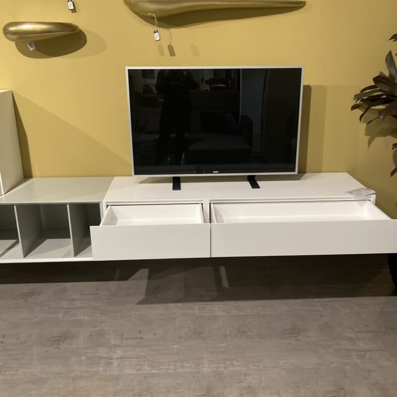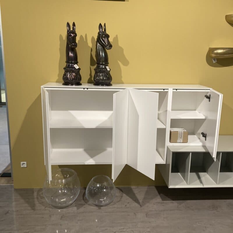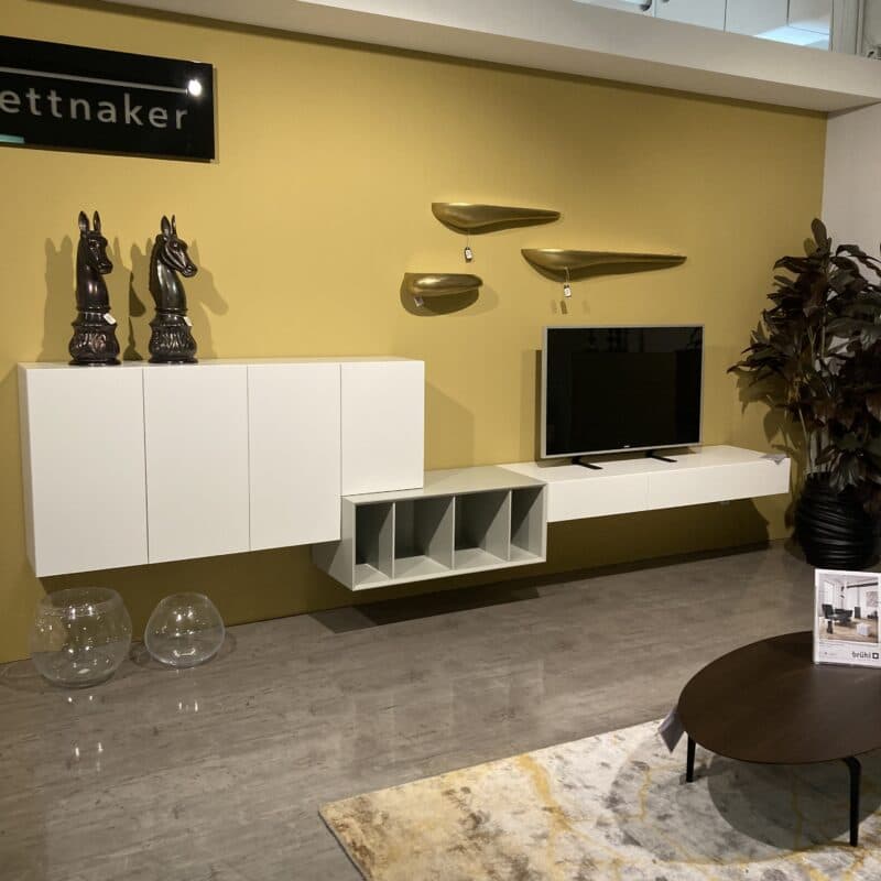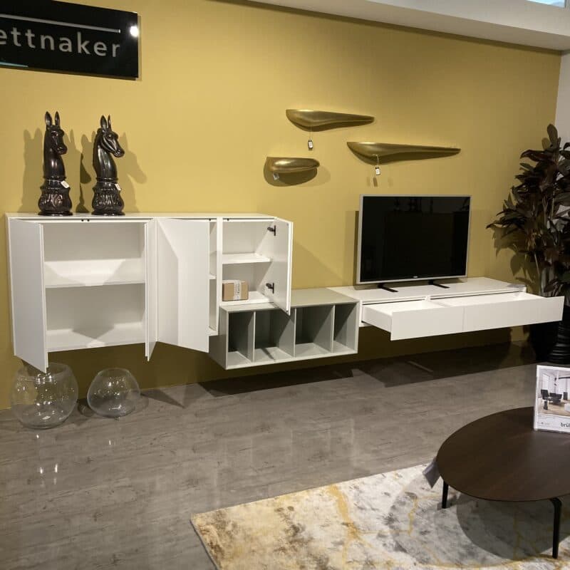 Die Wohnwand Alea von Kettnaker überzeugt mit klarer Formensprache und edler Lack-Oberfläche in Weiß matt und Steingrau. Bestehend aus zwei Hängeelementen mit Schubkästen bzw. Vier Türen sowie einem Regalelement in Steingrau. Inklusive Quick-out-Beschlag für komfortables Öffnen – modern, elegant, durchdacht. Die Regalwand kann gerne vor Ort in unserer Ausstellung in Stockach besichtigt werden.