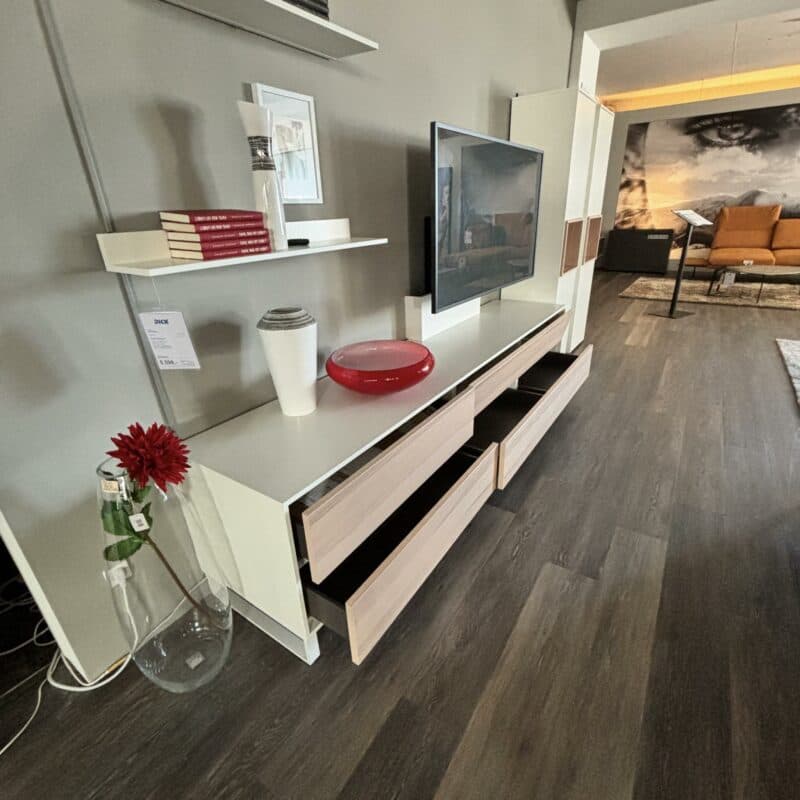 Die Wohnwand Focus von RMW besticht durch elegantes Design und hochwertige Verarbeitung. Der Korpus in Lack Weiß und die Füße aus Metall in Weiß verleihen ihr eine moderne Optik. Mit vier Schubladen und der praktischen Push-to-Open-Funktion bietet sie zudem optimalen Stauraum und Bedienkomfort. Die Wohnwand kann gerne vor Ort in unserer Ausstellung in Lauchringen besichtigt werden.