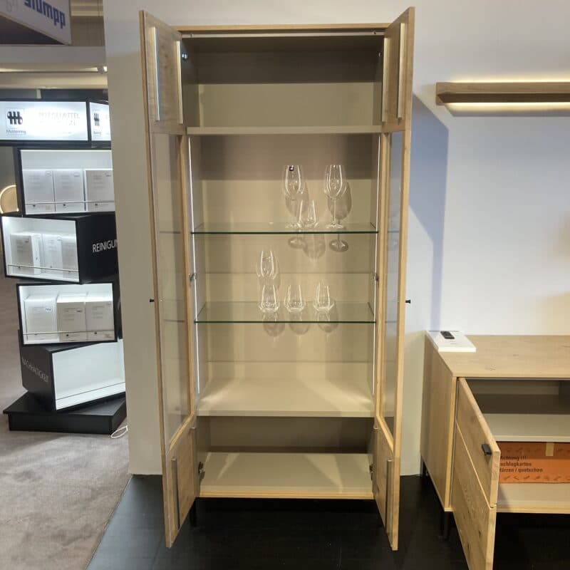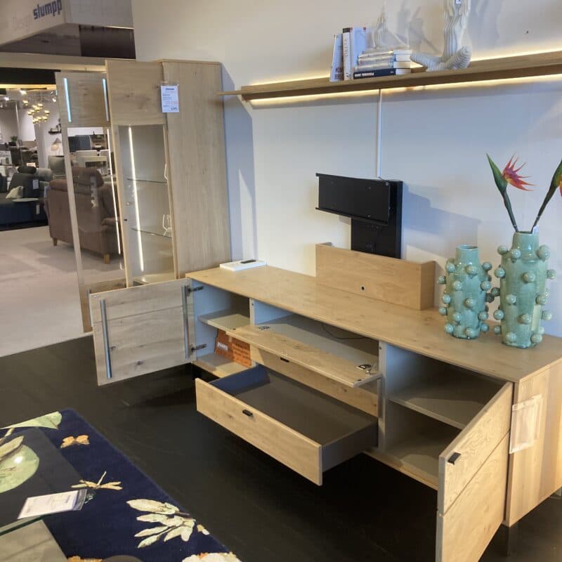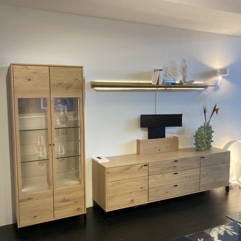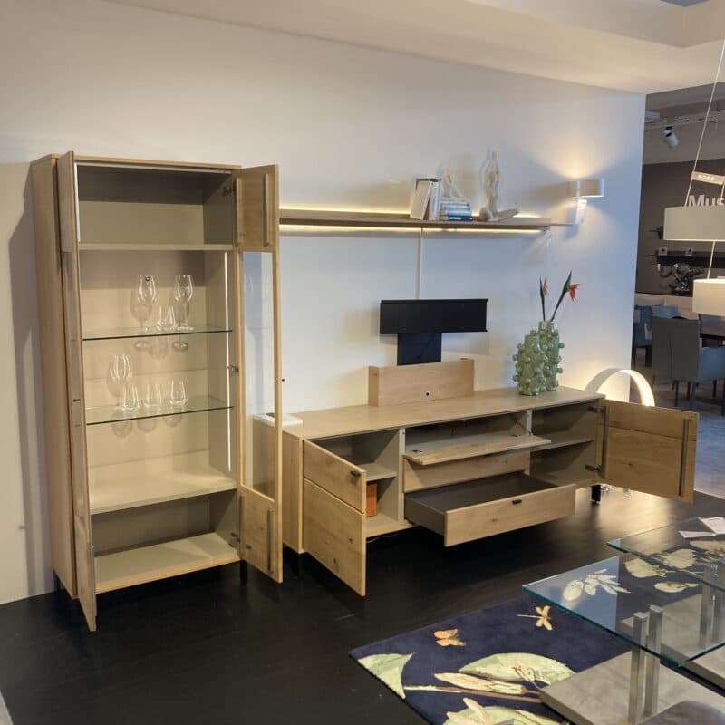 Die Wohnwand von RMW Fontana verbindet Funktionalität mit modernem Design. Das Sideboard mit Türen, Schubkästen, Klappe und Holzblende bietet viel Stauraum. Vitrine mit Glas- und Holzböden sowie Paneelwandboard ergänzen das Ensemble. Lack Cashmere und Asteiche massiv wirken edel. Inklusive TV-Halterung, Wandbefestigung, Repeater, Funkempfänger und Funkfernbedienung. Die Wohnwand kann gerne vor Ort in unserer Ausstellung in Stockach besichtigt werden.