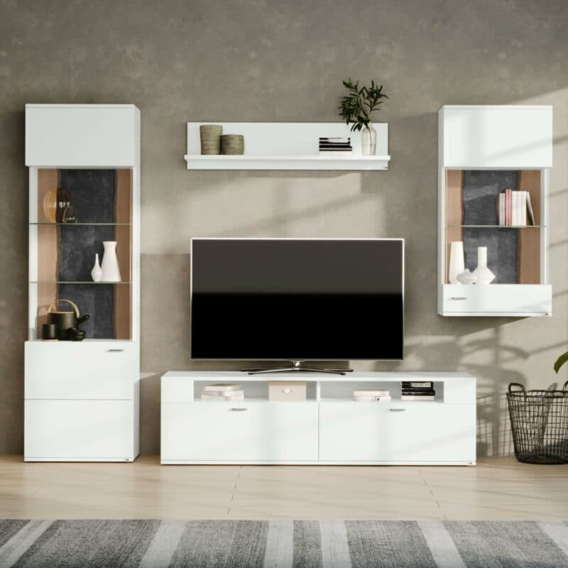 Die Rückwände in den Vitrinen in massiver Rindholz-Eiche mit einem Dekor in Schiefer machen diese Kombination zu einem echten Hingucker in jedem Wohnzimmer. Fronten und Korpus sind in Arctic weiß Hochglanz und Arctic weiß gehalten, was einen schönen Kontrast zu den Rückwänden ergibt. Die verschiedenen Komponenten werden mit LED-Beleuchtungen in Szene gesetzt und tauchen Ihren Wohnraum in ein angenehm warmes Licht.